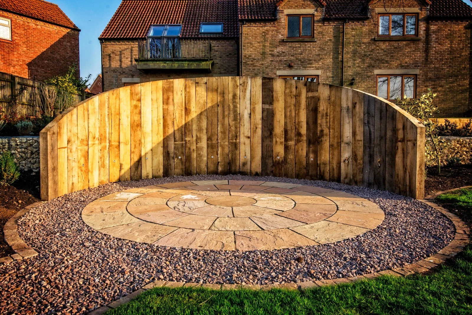 A beautifully crafted natural sandstone paving circle in Sunset Buff – featuring a harmonious